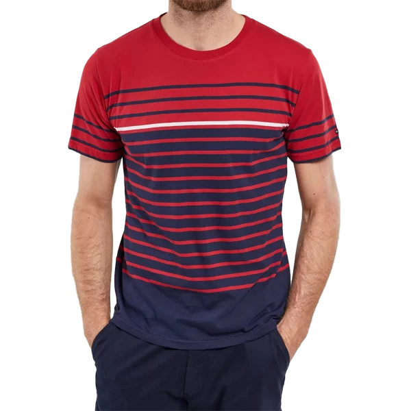 – Tee-shirt rouge avec des rayures bleues et une rayure blanche à la poitrine