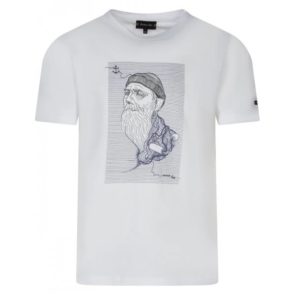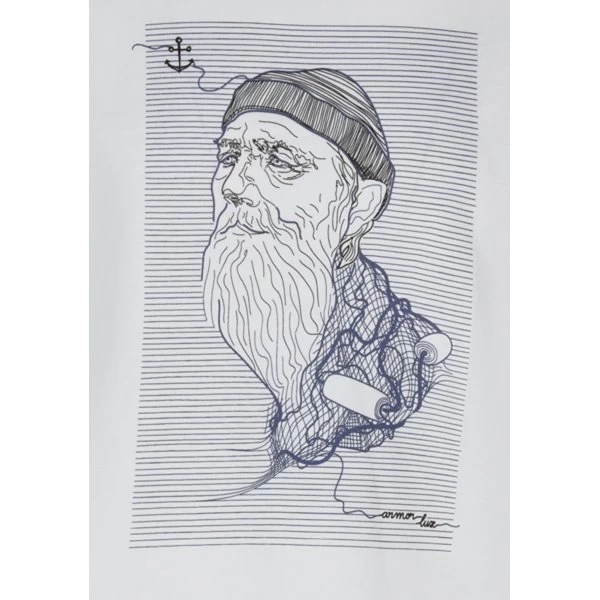 – Marin floqué en noir et bleu sur fond à rayures marine au milieu poitrine