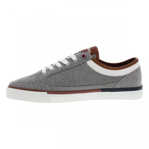 – Empeigne en toile grise avec surpiqûres ton sur ton et languette avec écusson marron cousu