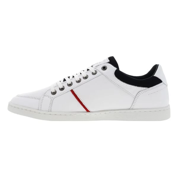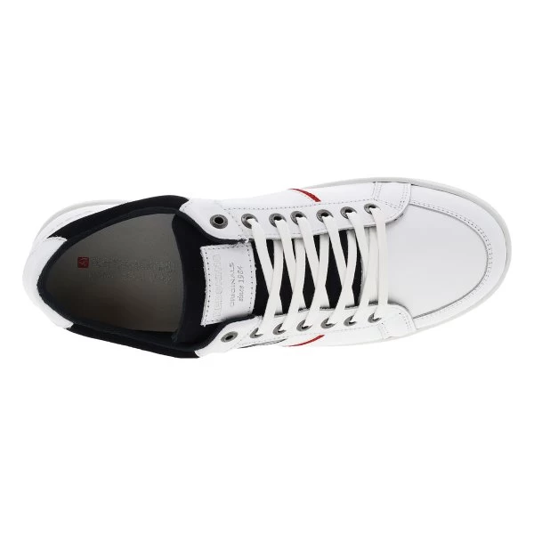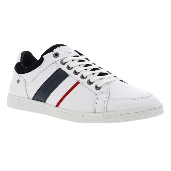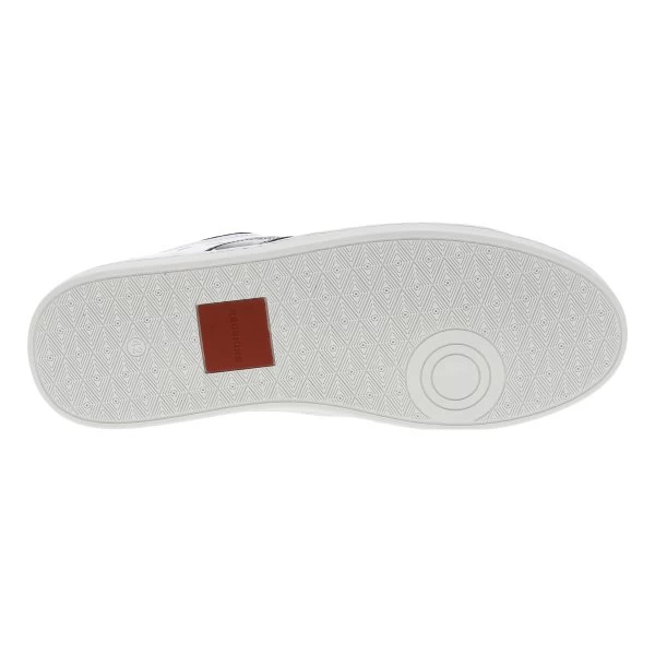– Étiquette en cuir blanc embossé de la marque et cousue sur la languette