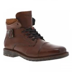 Boots Fourrées Bugatti, En Cuir Patiné Cognac, à Semelle Plate Et Lacets Et Zip Latéral