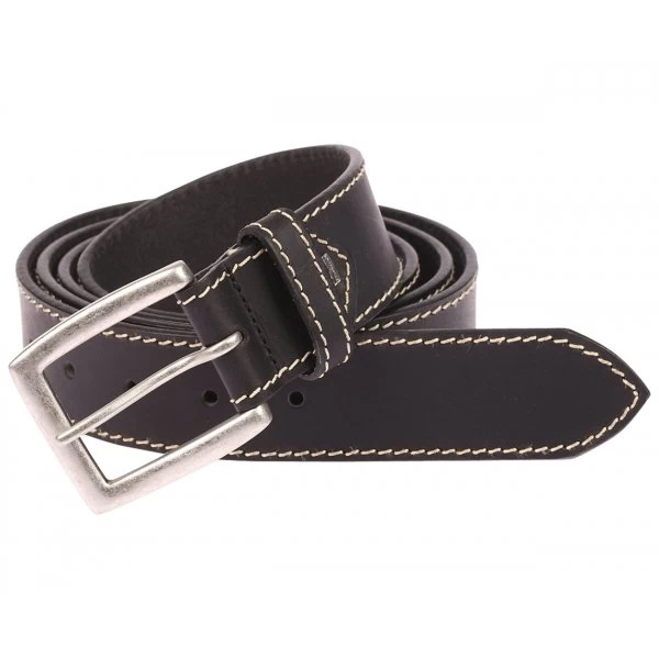 Ceinture grande taille Lindenmann , surpiqûres beiges, 5 trous, rivet plat argenté “L”, boucle matte rectangulaire argentée, 3.7cm de large, cuir, noir