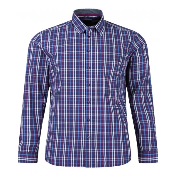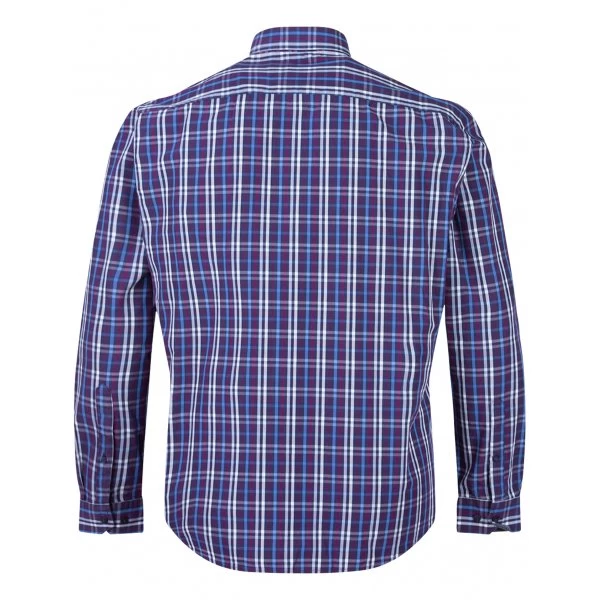 Chemise JT Ascott, carreaux violets, bleus, et blancs, 1 poche poitrine, boutons, poignets cassés fermés par un bouton, col Français, coupe droite, 100% coton