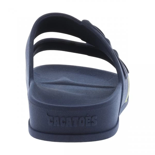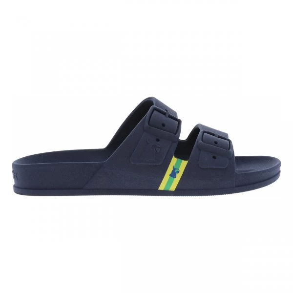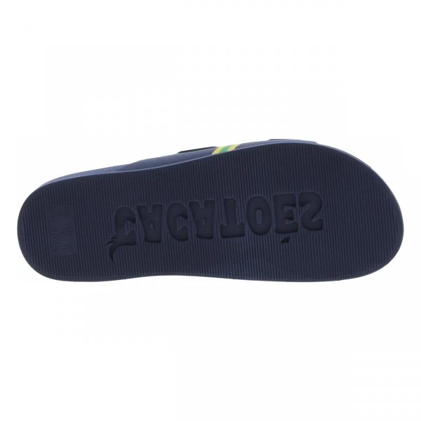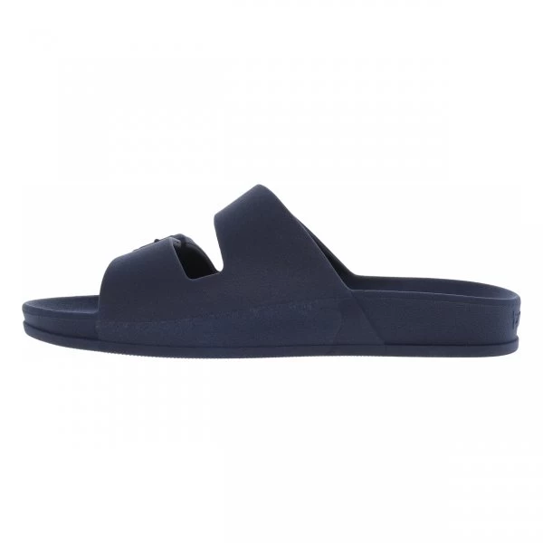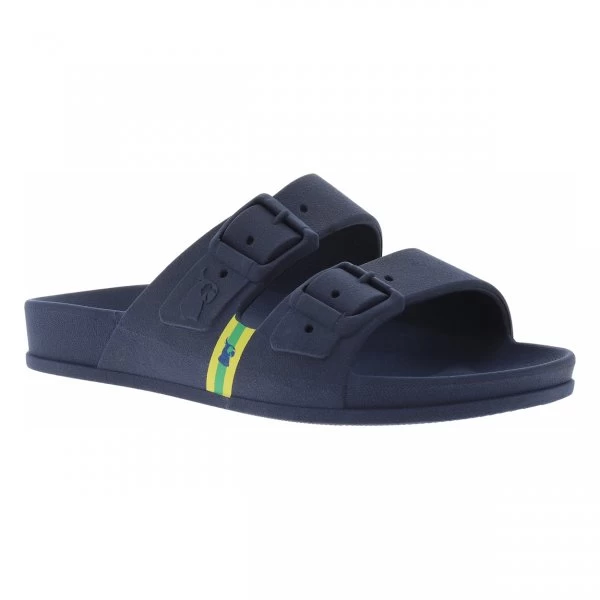 – Claquettes bleues avec drapeau et logo de la marque floqués sur la semelle entre les 2 brides