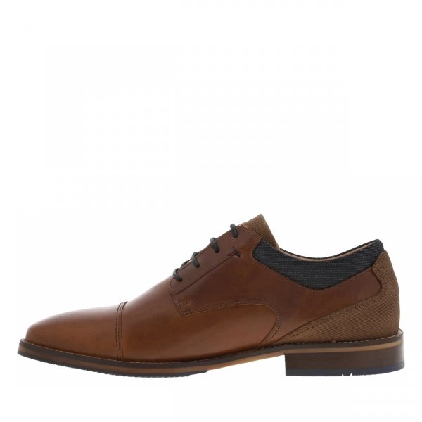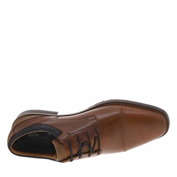 – Derbies en cuir cognac avec patch beige cousu sur le contrefort