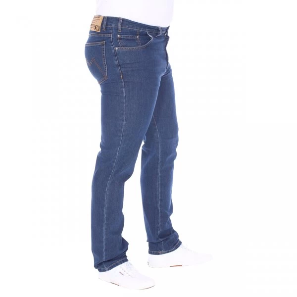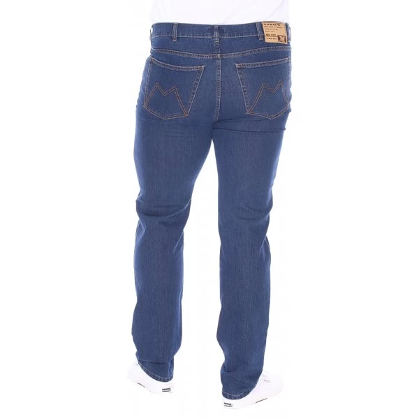 Jeans Maxfort, 5 poches, rivets et passants métallisés, coupe droite, fermeture par zip, 78% coton, 20% polyamide, 2% élasthanne, surpiqûres oranges, bleu