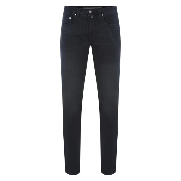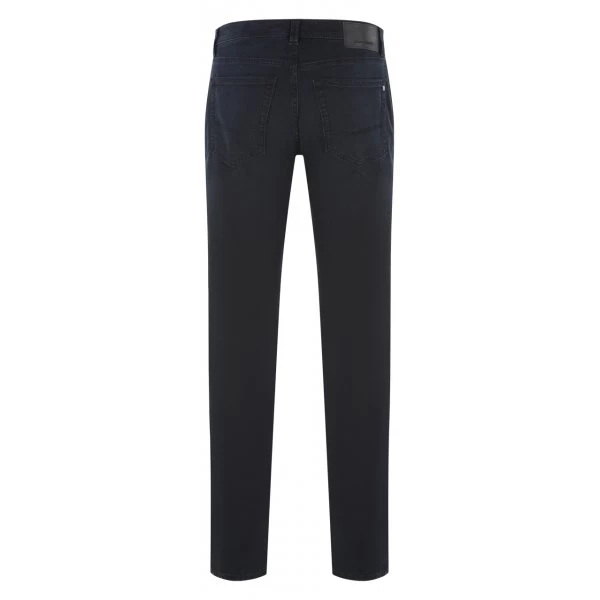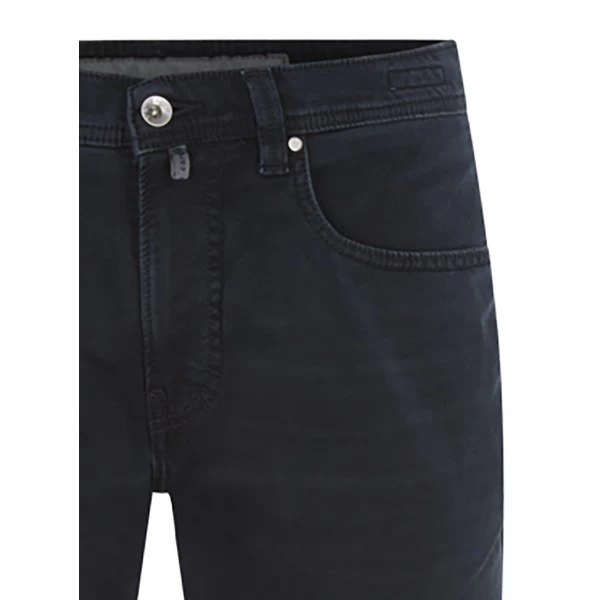– Jean bleu nuit avec le nom de la marque inscrit en relief sur patch noir effet cuir sur la ceinture