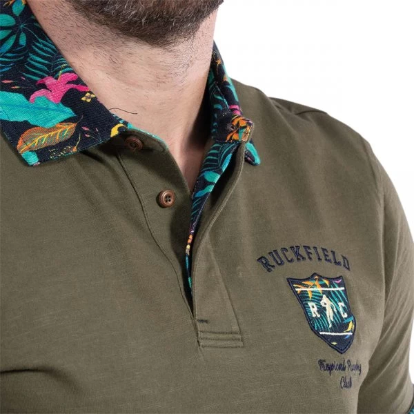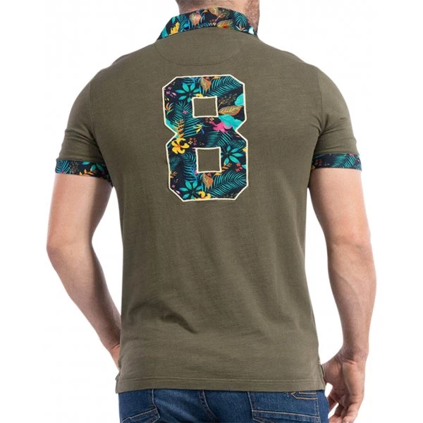 – Col et extrémités des manches fleuri vert, rose et jaune sur fond marine