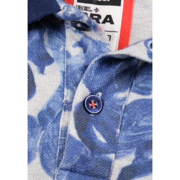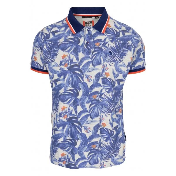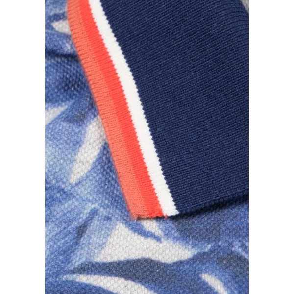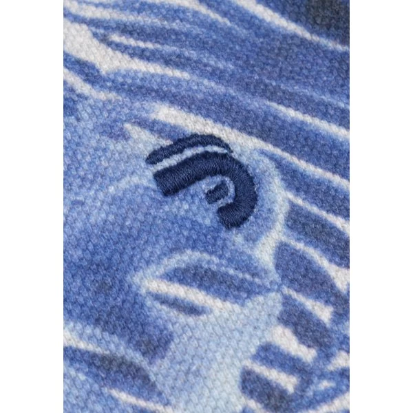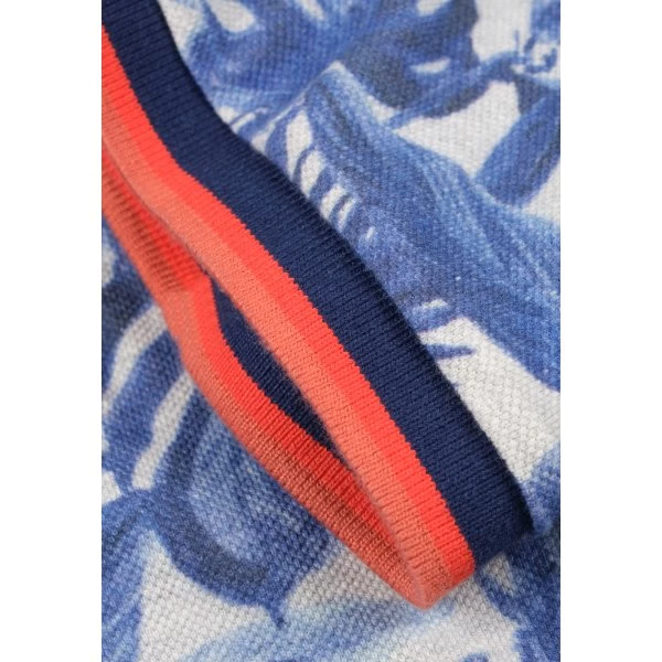 – Imprimé feuilles tropicales bleues et fleurs oranges sur fond écru