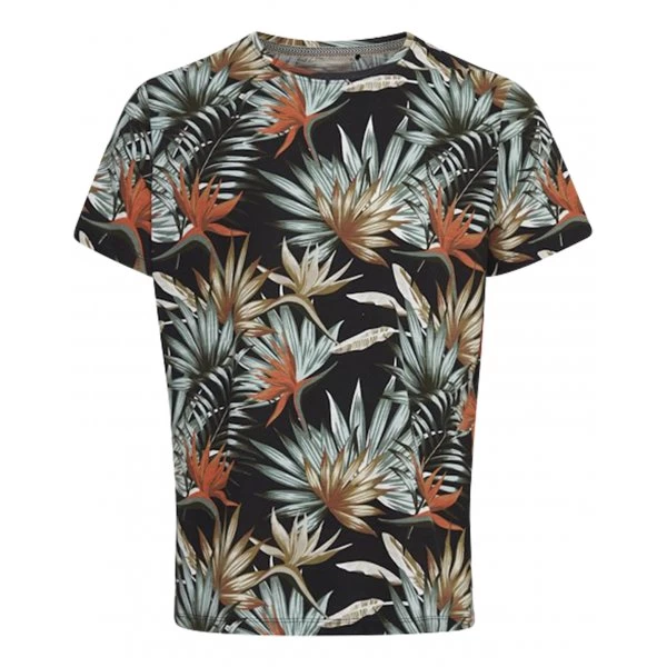– Tissu léger noir à feuilles et fleurs exotiques allover